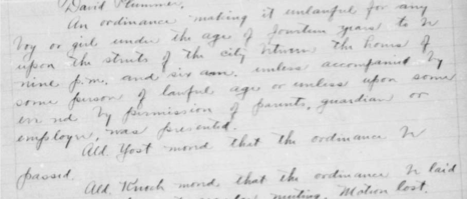 Today’s municipal code makes it “unlawful for a person less than seventeen” to be in public after 12:01am, but curfew certainly isn’t a modern concept.