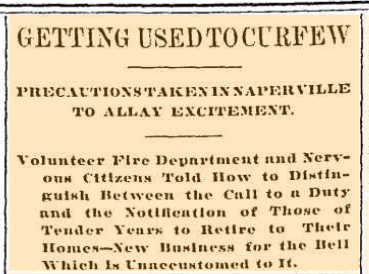 To guard against any further misunderstanding the night police force of Naperville made it his business yesterday to make a house to house canvass of the members of the fire department and carefully explained to them how to distinguish between the dignified tolling of the curfew and the wild, riotous note of the bell when employed in informing the community that a fire was in progress.